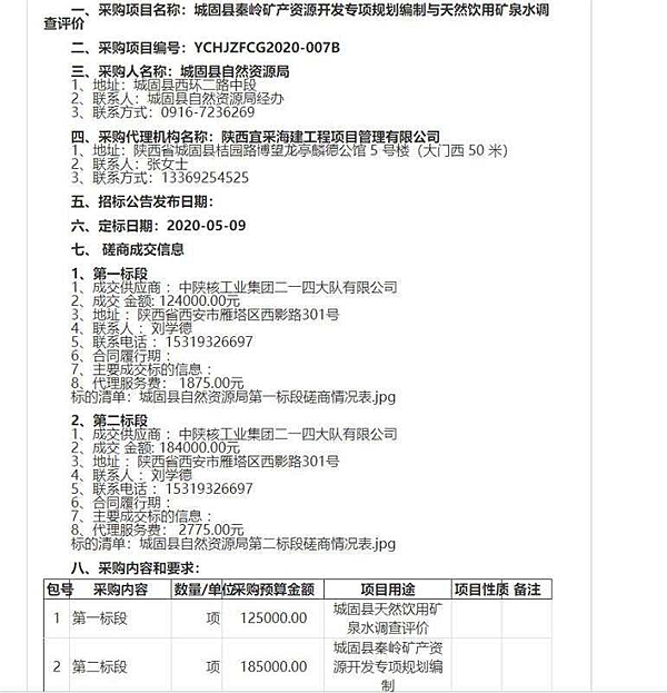 5月14日,從陜西省政府采購網獲悉,公司成功中標《城固縣秦嶺專項規劃編制與天然飲用水調查評價》項目2個標段。