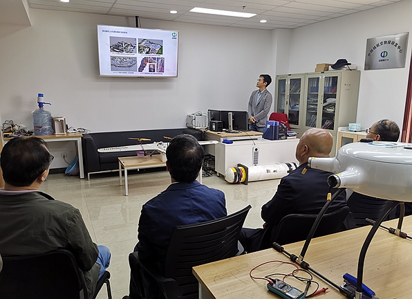 高利鵬一行首先來到公司物化探院無人機(jī)航空物探研發(fā)中心,仔細(xì)觀看了研發(fā)的各型無人機(jī)平臺(tái)及搭載的物探設(shè)備,認(rèn)真聽取了無人機(jī)航空物探研發(fā)中心首席專家沈銘成博士就航空測(cè)量、航空放射性、航空磁測(cè)、航空瞬變電磁等系統(tǒng)的研發(fā)應(yīng)用情況的匯報(bào)。二一四大隊(duì)副總經(jīng)理冉軍林就物化探專業(yè)隊(duì)伍建設(shè)現(xiàn)狀、“十三五”發(fā)展思路及下一步專業(yè)化隊(duì)伍走“融合發(fā)展”,打造“產(chǎn)業(yè)物探”道路的設(shè)想進(jìn)行了詳細(xì)匯報(bào)。