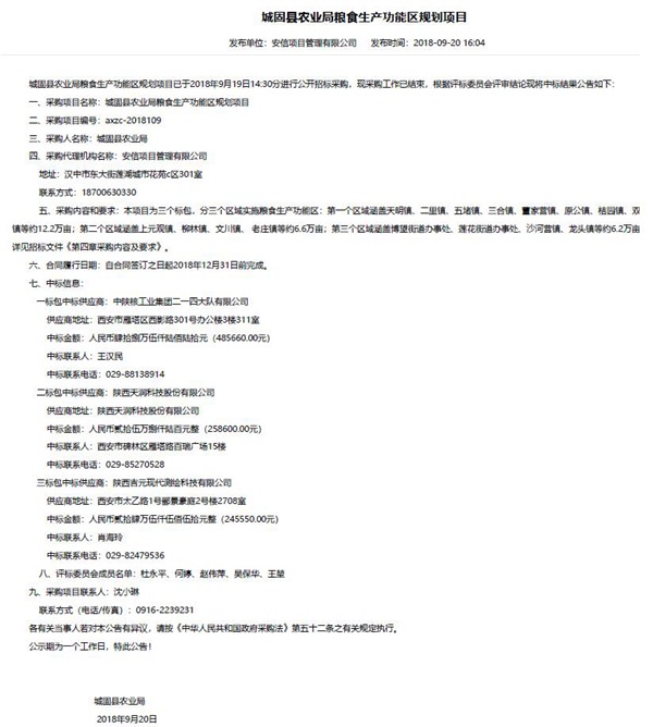 2018年9月20日,在城固縣農(nóng)業(yè)局糧食生產(chǎn)功能區(qū)規(guī)劃項(xiàng)目進(jìn)行公開招標(biāo)采購中,公司憑借詳實(shí)完善的技術(shù)方案,成功中標(biāo)“城固縣農(nóng)業(yè)局糧食生產(chǎn)功能區(qū)規(guī)劃項(xiàng)目”。